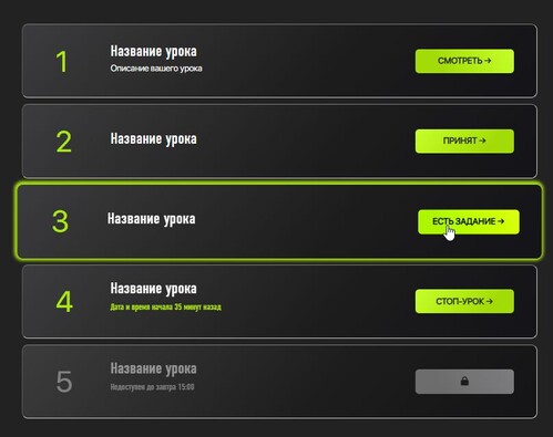 Черный фон с яркими салатовыми акцентами создаёт контрастную и энергичную атмосферу, что привлекает внимание и может стимулировать активность. Это оформление может быть подходящим для более динамичных и нестандартных курсов.