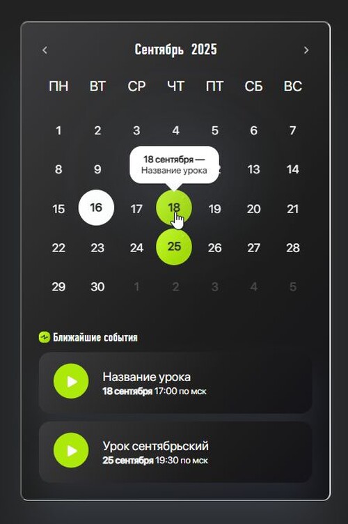 - В всплывающей подсказке отображается время, название тренинга где будет событие и кликабельное название урока.