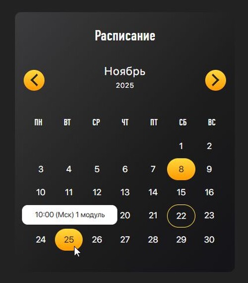 - Отображается дата открытия модуля. Дата подтягивается из расписания уроков (проверяется список уроков и будет подтянута дата с первого попавшегося по списку урока с расписанием).