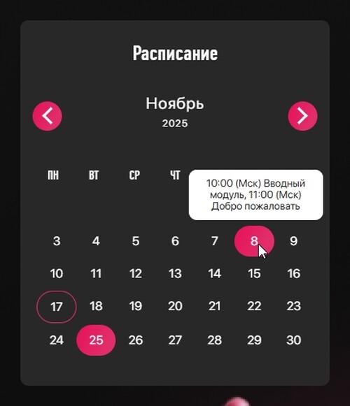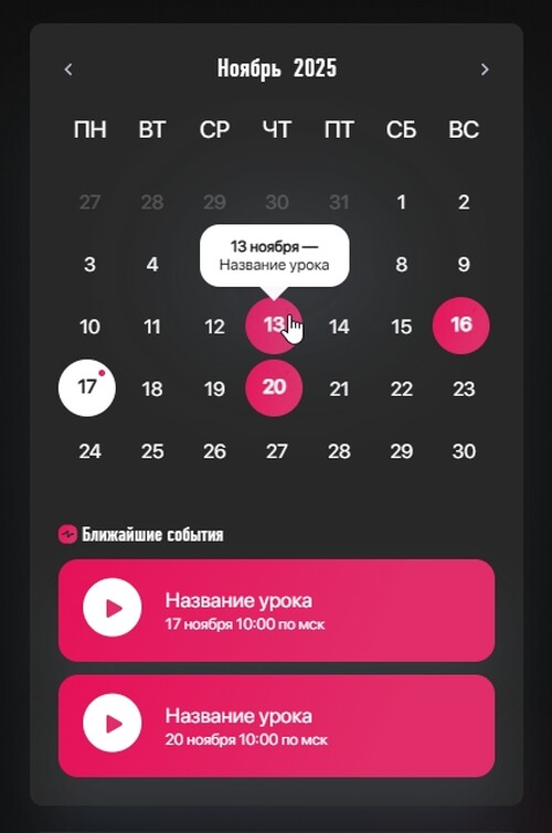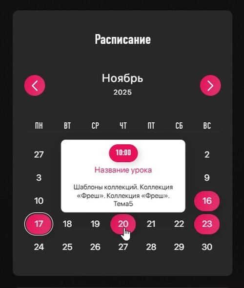 Наглядное и стильное расписания в виде календаря, поможет ученикам не пропускать важные события обучения и станет украшением вашего тренинга.