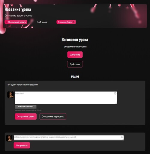 Это оформление строится на гармоничном сочетании глубокого темного фона и розовых акцентов. Розовый цвет задаёт тон основательности и интеллектуальной глубины, символизируя профессионализм и системность. Розовые элементы привносят лёгкость, смягчая общее восприятие. Такой визуальный язык идеально подходит для образовательных проектов и экспертных платформ, где важно одновременно продемонстрировать компетентность и обеспечить комфортную среду для обучения.