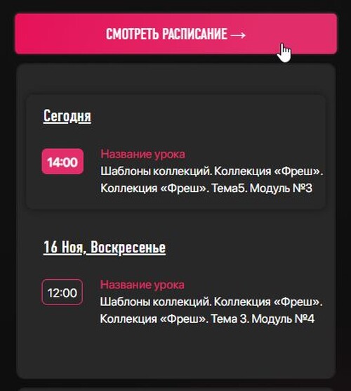 - Отображается дата открытия модуля. Дата подтягивается из расписания уроков (проверяется список уроков и будет подтянута дата с первого попавшегося по списку урока с расписанием).