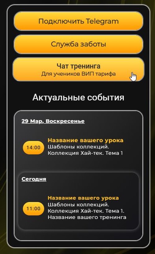 Практичный шаблон «Нежность» поможет оформить аккаунт за несколько минут. Заменяйте цвета, добавляйте свои изображения и используйте шаблон для любой ниши. Благодаря интуитивному интерфейсу и продуманной структуре, он позволяет ученикам легко ориентироваться в тренингах, уроках и заданиях, предоставляя всю необходимую информацию в одном месте.