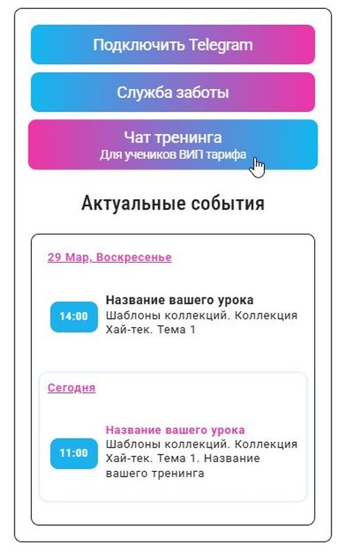 Этот шаблон предлагает интуитивно понятную структуру и функциональные решения, такие как плиточные карточки, динамичное расписание, баннеры и анимации. Всё это создает удобный интерфейс для учеников, облегчая навигацию по тренингам и урокам.