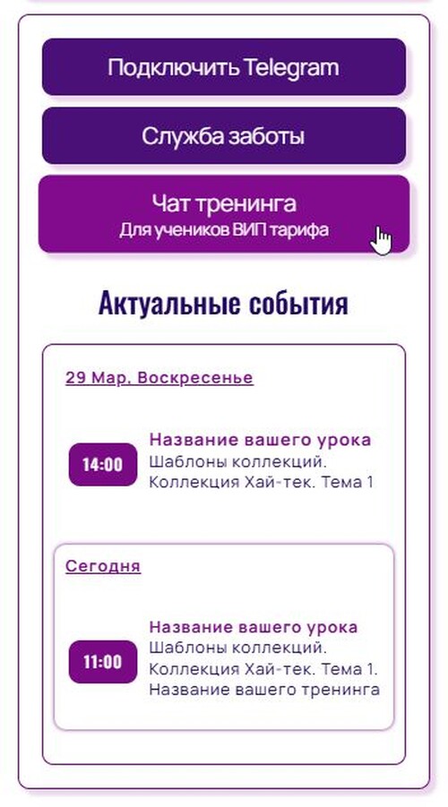 Этот шаблон предлагает интуитивно понятную структуру и функциональные решения, такие как плиточные карточки, динамичное расписание, баннеры и анимации. Всё это создает удобный интерфейс для учеников, облегчая навигацию по тренингам и урокам.