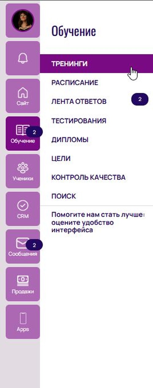 *При нажатии на тренинг, под ним раскрывается список его уроков