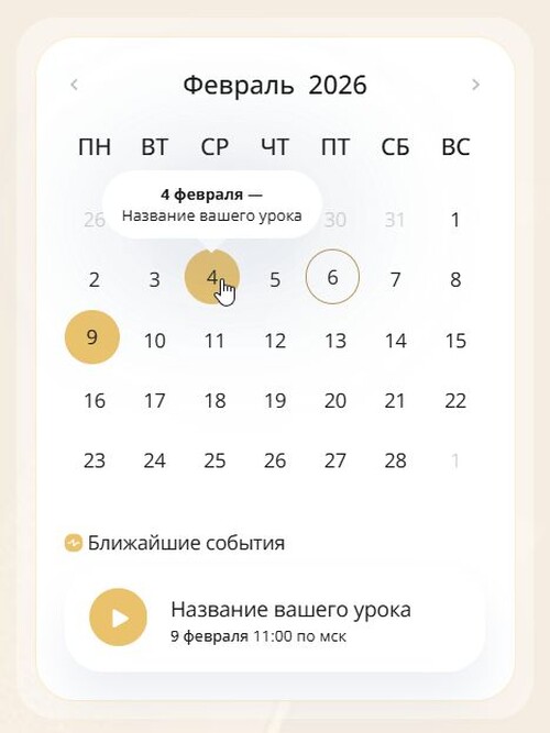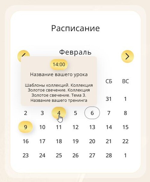 Наглядное и стильное расписания в виде календаря, поможет ученикам не пропускать важные события обучения и станет украшением вашего тренинга.