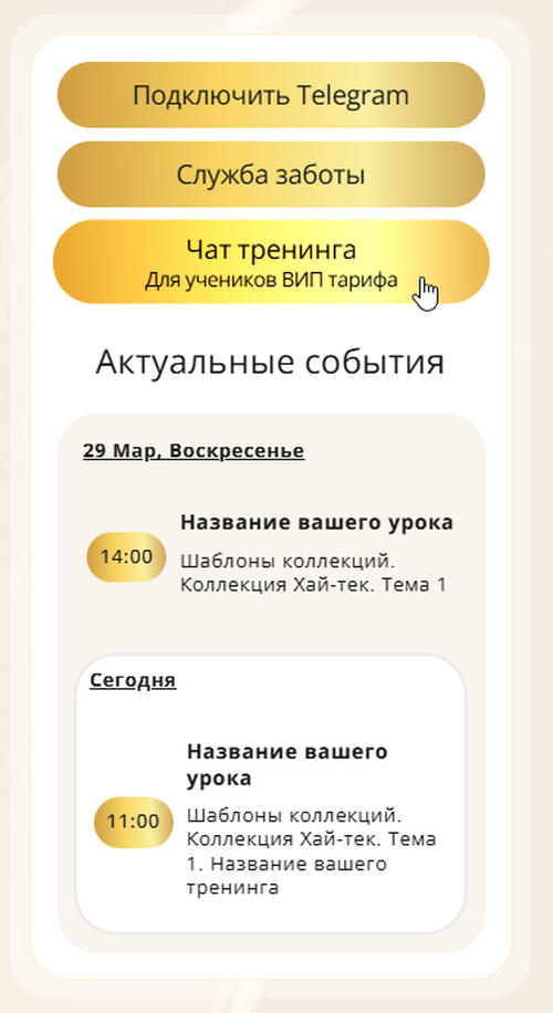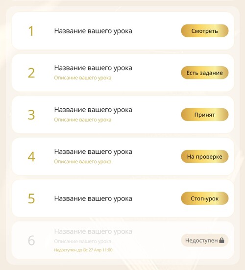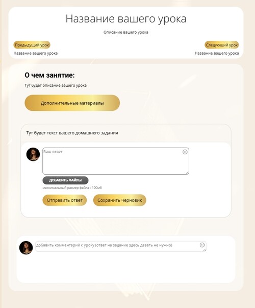 Шаблон «Золотое свечение» Тема 3 — это стильное и удобное решение для оформления онлайн-обучения на платформе GetCourse, ориентированное на комфорт студентов. Интуитивно понятный интерфейс и продуманная структура позволяют учащимся без труда находить тренинги, уроки и задания, предлагая всю необходимую информацию в одном месте.